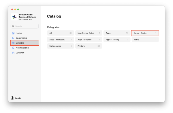 To install Adobe Creative Cloud, first open the Self Service Plus application by searching for it with Spotlight(the magnifying glass in the top right of your screen). Once you have opened Self Service Plus, select Catalog from the list on the left, then click on Apps - Adobe.